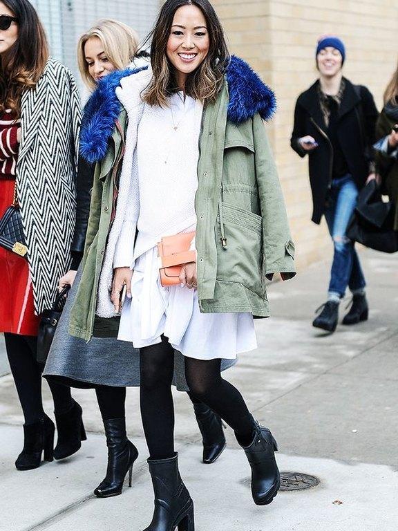 Με μαύρο mini φόρεμα και μποτάκια, το parka σου δένει ιδανικά όσο και αν δεν σου ταιριάζει εκ πρώτης όψεως. Ιδικά αν είναι και κάποιο από λεπτό ύφασμα και φωτεινό πράσινο χρώμα. Très chic!