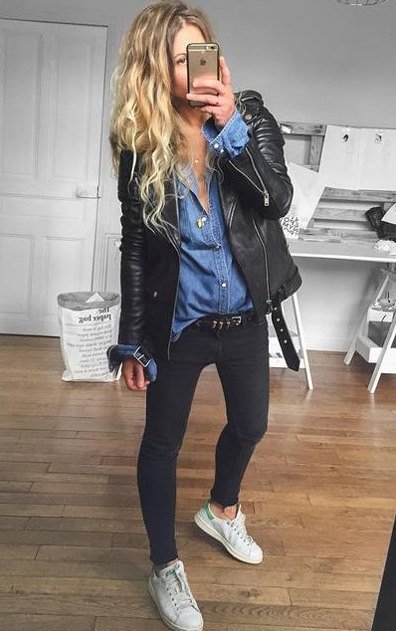 Αν προτιμάς τα σκούρα χρώματα, φόρεσε το μαύρο σου δερμάτινο με ένα μαύρο jeans και τα αθλητικά παπούτσια σου.