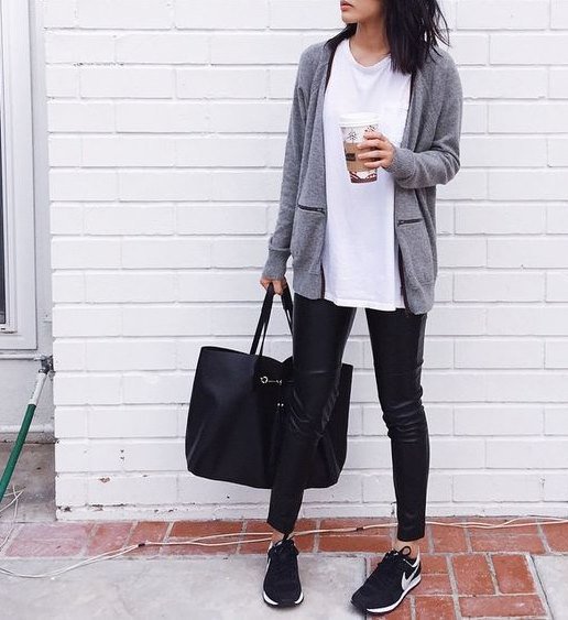 Το δερμάτινο κολάν είναι η απόλυτα άνετη και μοδάτη επιλογή για το καθημερινό σου ντύσιμο με αθλητικά παπούτσια. Ολοκλήρωσε την εμφάνιση με μια φαρδιά ζακέτα και ένα απλό t-shirt.