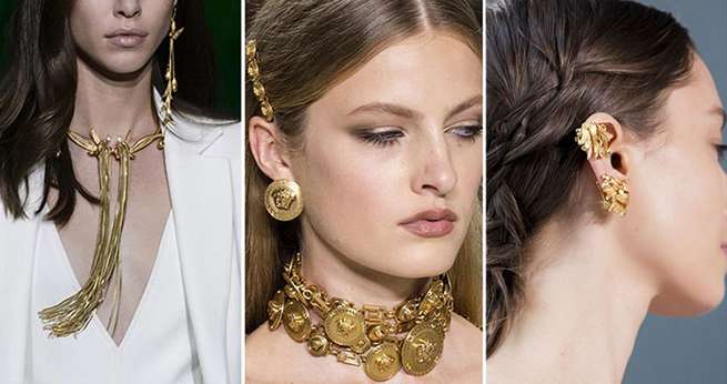 Τα χρυσά κοσμήματα και αξεσουάρ μαλλιών αποτέλεσαν μια από τις κορυφαίες επιλογές των διάσημων οίκων μόδας για τη σεζόν. Σκουλαρίκια, βραχιόλια, κολιέ και τσιμπιδάκια ή μπαρέτες μαλλιών σε χρυσές αποχρώσεις με περίτεχνα ή απλά σχέδια ολοκλήρωσαν τις προτάσεις των σχεδιαστών με υπέροχο τρόπο.