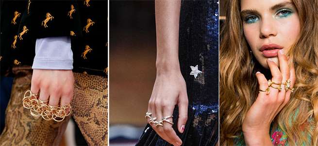 Μια ακόμη ενδιαφέρουσα τάση των αξεσουάρ για την Άνοιξη και το Καλοκαίρι είναι αυτή των πολλών πανομοιότυπων δαχτυλιδιών. Ξεχάστε λοιπόν τα μεγάλα και ογκώδη δαχτυλίδια και επιλέξτε να φορέσετε πολλά περισσότερα μικρά ταυτόχρονα σε όλα σας τα δάχτυλα. Πρόκειται για ένα accessories trend που συνδυάζεται με όλα τα ρούχα και ολοκληρώνει με εντυπωσιακό τρόπο το look σας.