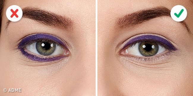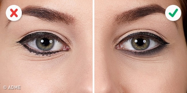Αυτή η μικρή λεπτομέρεια μπορεί να καταστρέψει ακόμα και τα πιο τέλεια μακιγιάζ και αναφέρεται στην γραμμή κοντά στη κόγχη του ματιού, η οποία στην αριστερή εικόνα ακολουθεί και φτάνει ως την άκρη του ματιού, ενώ στη δεξιά σταματάει νωρίτερα, κοινώς είναι πιο κοντή. Αυτό έχει σαν αποτέλεσμα να χάνετε η συμμετρία των ματιών, αφού το δεξί μάτι δείχνει πιο μακριά από το άλλο.
