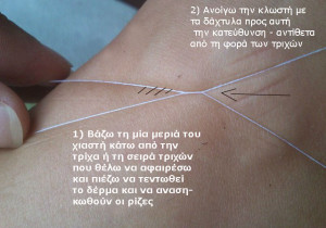 • Προσπαθήστε, τώρα, με το άνοιγμα των δακτύλων σας εναλλάξ (μία το ένα χέρι, μία το άλλο), να μεταφέρεται το ‘χιαστή’ της κλωστής μία δεξιά και μία αριστερά. Αυτές είναι οι κινήσεις που θα κάνετε όταν τοποθετήσετε την κλωστή στο δέρμα για να αφαιρέσετε τρίχες.