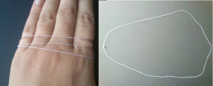 • Πάρτε μία κλωστή ραπτικής (όχι συνθετική γιατί πονάει, ούτε να είναι απαλή σαν βαμβάκι γιατί κόβεται εύκολα… μία ενδιάμεση κατάσταση), κόψτε ένα κομμάτι, τόσο ώστε να τυλίγεται 3 φορές γύρω από την ανοιχτή παλάμη σας – εικόνα 1.
