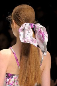 Η κοτσίδες είναι πολύ στη μόδα για μακριά μαλλιά. Αν ανήκετε σε αυτή την κατηγορία τότε δέστε πάνω από τη λαστιχάκι σας ένα όμορφο μαντήλι.Φροντίστε να μην κάνετε 2 κόμπους στο μαντήλι για να το στερεώσετε γιατί δείχνει πολύ ογκώδες, απλά δέστε το μία φορά και στερεώστε το μέσα από το λαστιχάκι.