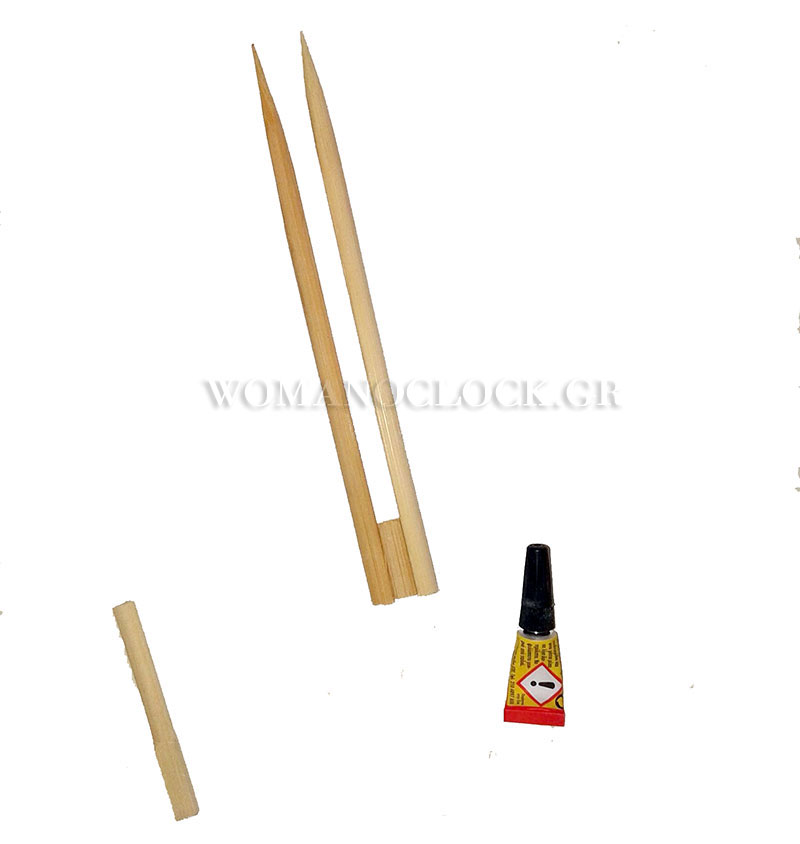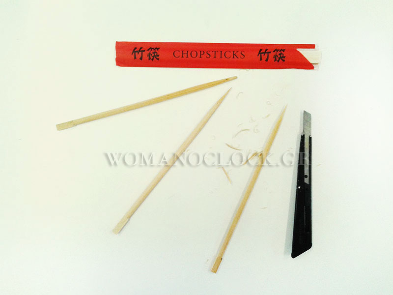 ΒΗΜΑ 1: Παίρνουμε τρία chopsticks φαγητού και με ένα μαχαίρι ξύνουμε μπροστά τη μία άκρη να γίνει μυτερή και στην άλλη άκρη αφαιρούμε από την επιφάνεια λίγο ξύλο ώστε να δημιουργηθεί μία εσοχή.