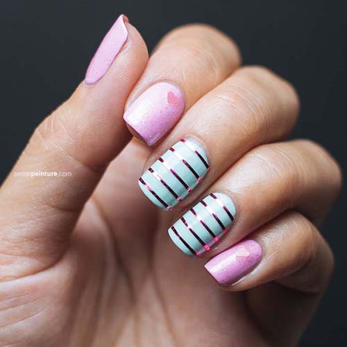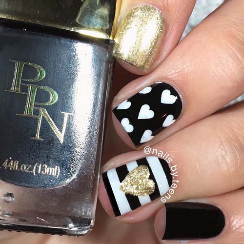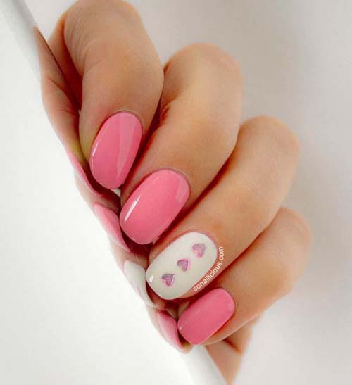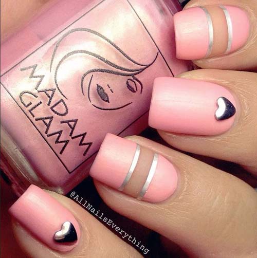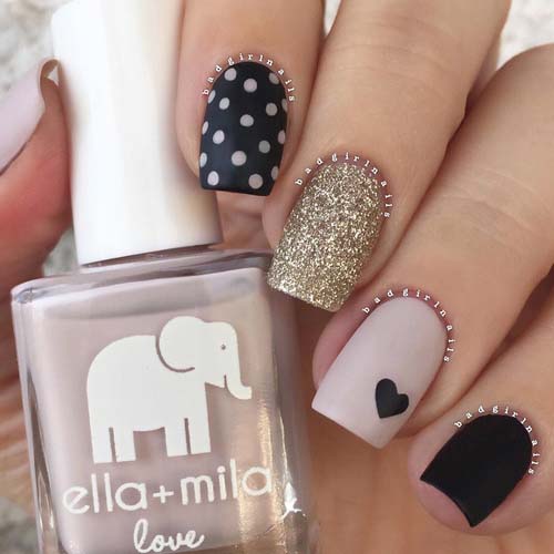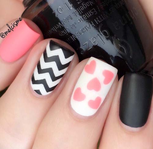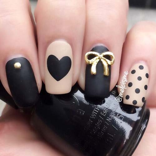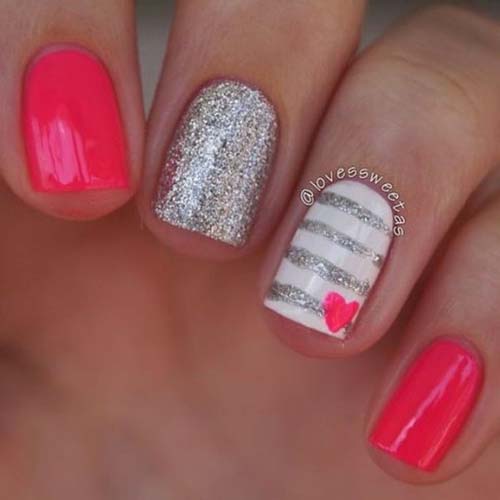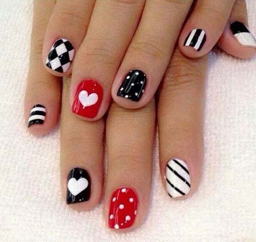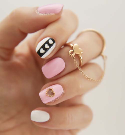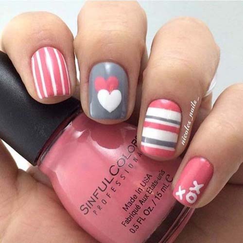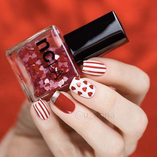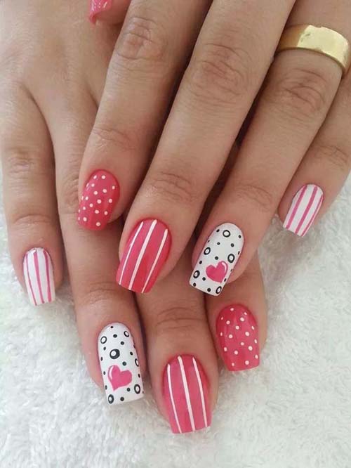 Στολίστε τα νύχια σας με καρδιές και γράμματα που σχηματίζουν λέξεις όπως Love. Επίσης, δοκιμάστε τα πουά ή τα ριγέ μανικιούρ, τα οποία είναι all time classic επιλογές για Valentine’s Day.
