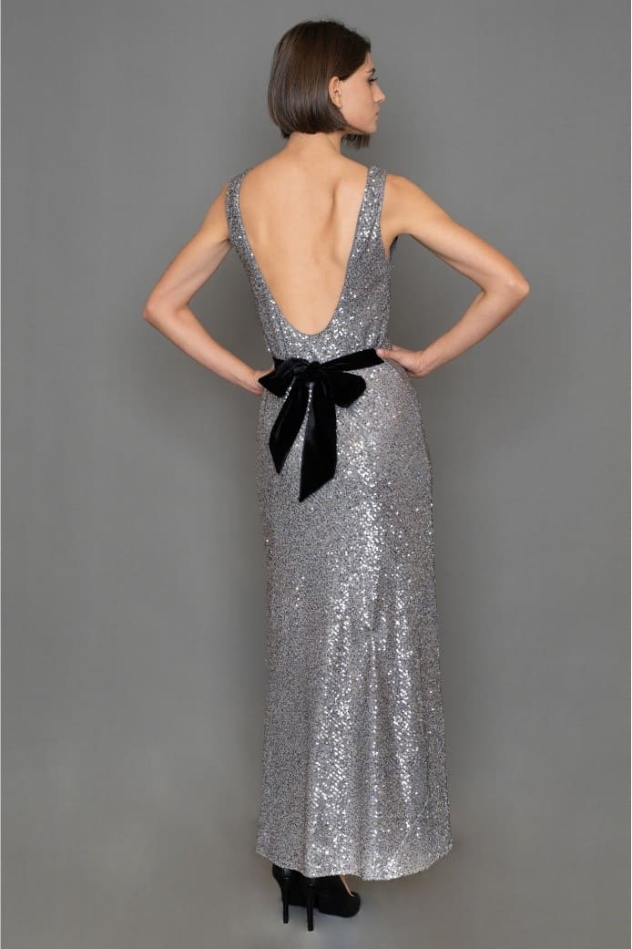 Hot seller για τη φετινή σεζόν, το φόρεμα με έντονο V στην πλάτη και μαύρο φιόγκο πλαισιωμένο από ασημένιες παγιέτες, που δίνει ένα πιο disco λουκ στην εμφάνισή σας. Το δέσιμο ξεκινάει από τα πλάγια και δεν αγκαλιάζει την κοιλιά. Έτσι μπορείτε να σφίξετε όσο θέλετε το φόρεμα, αναδεικνύοντας την εντυπωσιακή σιλουέτα σας, χωρίς να δημιουργεί την αίσθηση ζώνης, ενώ ο φιόγκος που δημιουργείται πίσω δίνει μία πιο elegant πινελιά στο φόρεμα.
