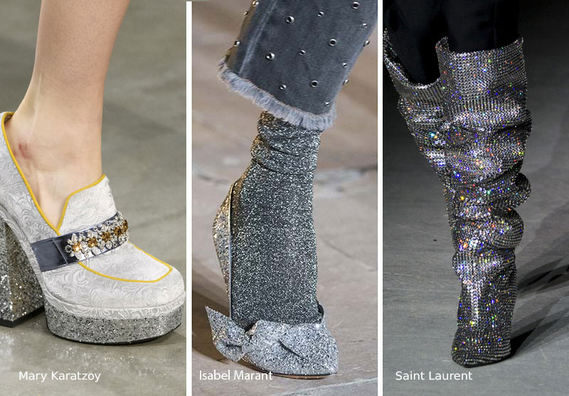 Σε αυτήν την τάση θα βρεις όση λάμψη χρειάζεσαι. Το glitter, τα strass και οι πέτρες θα βοηθήσουν για να επιτευχθεί ο στόχος σας! Αυτό το φθινόπωρο χειμώνα 2017 2018, το λαμπερό ασημί θεωρείται ως η κορυφαία τάση στα παπούτσια. Γυαλιστερές ασημένιες γόβες, μπότες, πέδιλα, κάλτσες