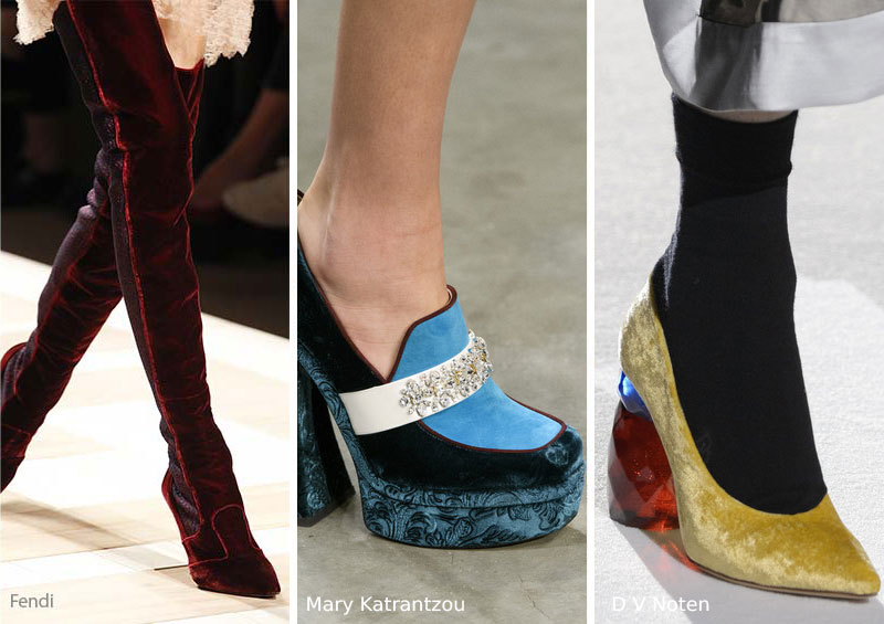 Το βελούδο έχει συνδεθεί με την πολυτέλεια και γιαυτό δεν θα μπορούσε να λείπει από τις τάσεις στα παπούτσια φθινόπωρο χειμώνας 2017/2018. Ιδιαίτερη εντύπωση έκαναν τα σχέδια της Mary Katratzoy, η οποία παρουσίασε παπούτσια από βελούδο με ανάγλυφα σχέδια που θυμίζουν βασιλικούς χορούς, πριγκίπισσες και παραμύθια.
