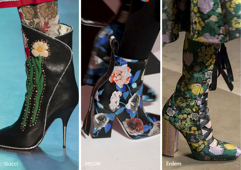 Συνεχίζουμε με όχι κάτι τόσο πρωτότυπο αλλά εξίσου ωραίο και εκκεντρικό, που είναι τα floral μοτίβα σε μπότες και μποτάκια. Τα φλοράλ μοτίβα εκτός από τα παπούτσια εμφανίζονται επίσης στα ρούχα και στις κάλτσες, είτε τυπωμένα πάνω στα υφάσματα είτε κεντημένα.