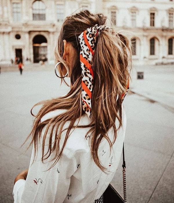 Εάν δεν θέλετε να αφιερώσετε πολύ χρόνο στο styling των μαλλιών σας, εδώ είναι η πρότασή μου: απλά δέστε ελαφρώς την αλογοουρά σας, με ένα κομψό μεταξωτό μαντήλι.