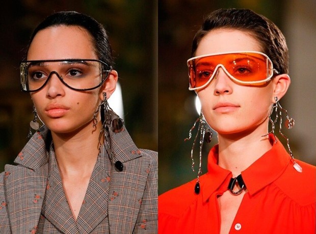 Αυτή τη σεζόν φοράμε γυαλιά που μοιάζουν με την προστατευτική μάσκα ενός εργαστηρίου ή προστατευτικές μάσκες των κηπουρών που χειρίζονται μια μηχανή του γκαζόν, φυσικά σε μια πιο κομψή εκδοχή αλλά διατηρώντας τις βασικές αρχές. Αυτά τα γυαλιά αγκαλιάζουν το πρόσωπο, έχουν ένα λεπτό μεταλλικό πλαίσιο, αλλά το κύριο στοιχείο είναι ένας πολύχρωμος ή διαφανής φακός.