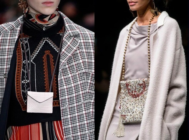Δίνουμε προσοχή στις τσάντες που φοριούνται σαν κολιέ στο στήθος, η οποία είναι μια νέα τάση στα αξεσουάρ φθινόπωρο χειμώνας 2018 2019. Ένα τέτοιο σχέδιο μπορεί να φορεθεί όλες τις ώρες της ημέρας.
