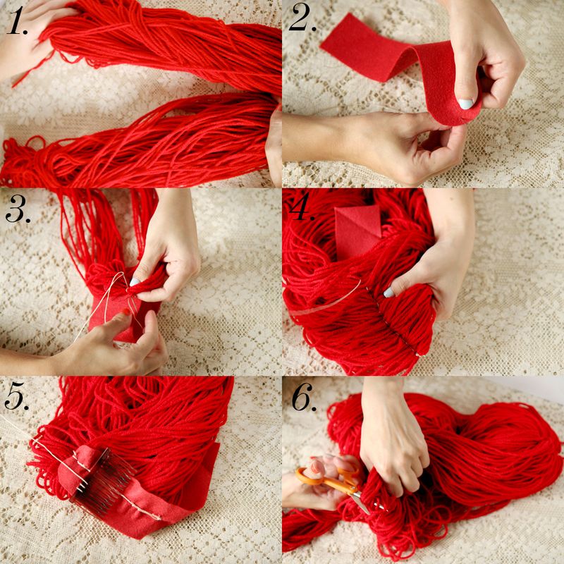 Διπλώστε τα νήματα στη μέση για να βρείτε το κέντρο και τοποθετήστε κατακόρυφα το μακρόστενο ύφασμα. Ξεκινήστε να ράβετε στη ράχη για να σταθεροποιήσετε τα νήματα. Μόλις ολοκληρωθεί η διαδικασία, ράψτε πάλι απ’την αρχή  από το ίδιο σημείο που ξεκινήσατε. Αφήστε ένα κενό περίπου 5 εκατοστών και ράψτε το χτενάκι πάνω στο ύφασμα.
