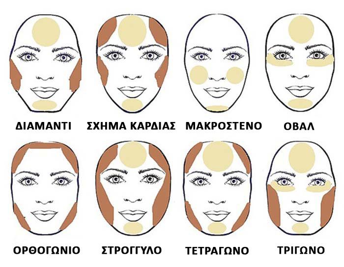 Αφού αναγνωρίσετε στις παρακάτω εικόνες το σχήμα του προσώπου σας, δοκιμάστε να τοποθετήσετε τη λάμψη στα σωστά σημεία.. Αυτά με το ανοιχτότερο χρώμα είναι τα σημεία φωτεινότητας και σκίασης τα σκούρα.