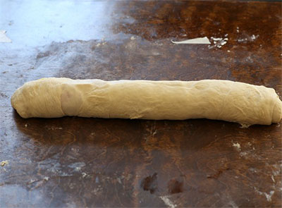 Κόβουμε το μεγάλο ρολό που έχουμε μπροστά μας σε 8 φέτες πάχους περίπου 4 εκ. την κάθε μία. Τοποθετούμε τις φέτες σε ένα ταψί καλυμμένο με λαδόκολλα. Σκεπάζουμε το ταψί και αφήνουμε τα ρολάκια να φουσκώσουν σε ζεστό μέρος (30° C), μακριά από ρεύματα, για 1 ώρα ή μέχρις ότου φουσκώσουν ελαφρώς.