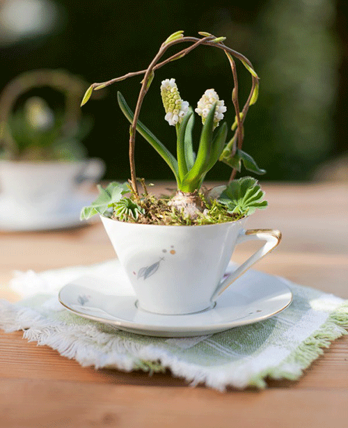 Ενα παλιό ή σπασμένο φλιτζάνι βρίσκει καινούργια χρήση ως μικρό γλαστράκι για έναν εποχικό βολβό.