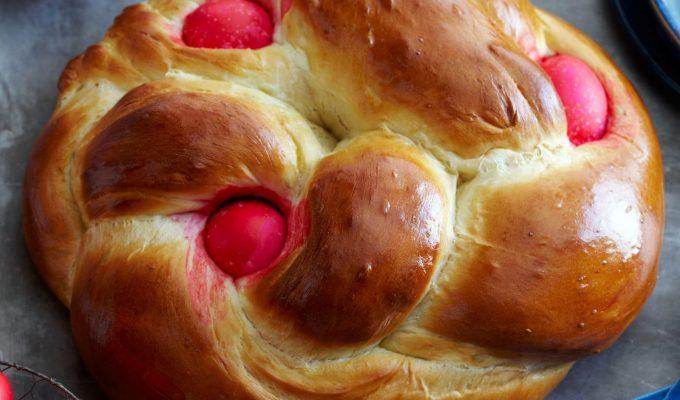 Τέλος, πλάθουμε 2 τσουρέκια, τα αφήνουμε να ξαναφουσκώσουν για 20-30 λεπτά, τα αλοίφουμε με λίγο ασπράδι και τα ψήνουμε στους 180 βαθμούς για 20 – 30 λεπτά