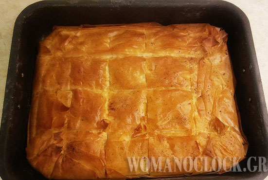 Σε ένα ταψί μακρόστενο στρώνουμε 4 φύλλα για τη βάση και τα λαδώνουμε ένα ένα κάθε φορά. Στρώστε τα φύλλα στο ταψί σταυρωτά εναλλάξ, ένα οριζόντια και ένα κάθετα. Ρίξτε το μείγμα, απλώστε το καλά και από πάνω τα υπόλοιπα με τον ίδιο τρόπο. Κόψτε τα φύλλα που περισσεύουν και διπλώστε προς τα μέσα για να κλείσετε την τυρόπιτα. Χαράξτε με ένα μαχαίρι και πασπαλίστε με λίγο πιπέρι.